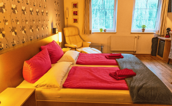 Die Pension liegt inmitten der wunderschönen Natur des Spreewaldes in Burg am Kurfürstendamm, direkt am Fließ. Hier finden die Gäste Ruhe, Entspannung und können dem Alltagsstress entfliehen. Für das leibliche Wohl wird im anliegenden Gasthaus gesorgt, wo vorwiegend spreewaldtypische Speisen zubereitet werden. In sieben modern eingerichteten Zimmern lässt sich ein erholsamer Aufenthalt genießen. Auf der weitläufigen Liegewiese findet man Ruhe, um zu entspannen und die Natur in ihrer Einmaligkeit zu genießen. Wer den Spreewald auf dem Wasser erkunden möchten, kann eine Tour mit dem Paddelboot oder Kahn vom hauseigenen Hafen starten. Auch ausgedehnte Wanderungen und Radtouren mit vor Ort erhältlichen Fahrrädern sind direkt von der Haustür aus möglich. Im Außenbereich der Pension ist ein Whirlpool und eine schwimmende Sauna verfügbar.